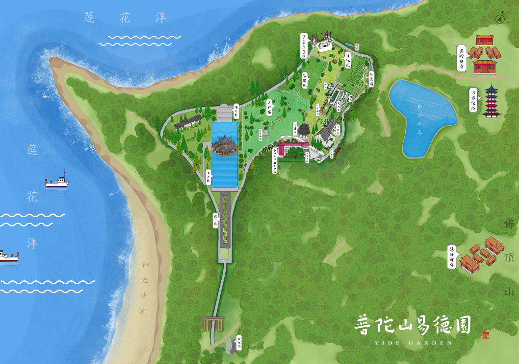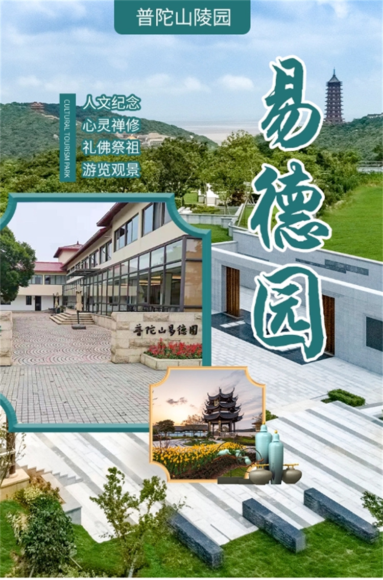 普陀山易德园,位于海天佛国普陀山之西北端,毗邻慧济寺、宝陀讲寺和万佛宝塔,距离南海观音、普济寺、法雨寺也仅十几分钟车程。玄武佳局,山海形胜。园区地形呈玄武遨游大海之势,枕靠佛顶之峰,承其龙脉;面向万顷莲洋,得之水运;左丘右陵环卫,藏风纳气;更有万佛宝塔咫尺护佑,实为佛光普照、福泽子孙之风水宝地。园区以“生态化、艺术化、人文化、公园化”为营造理念,规划【静园和禅园】两大园区,是集人文纪念、心灵禅修、游览观景于一体的新一代人文旅游纪念园。